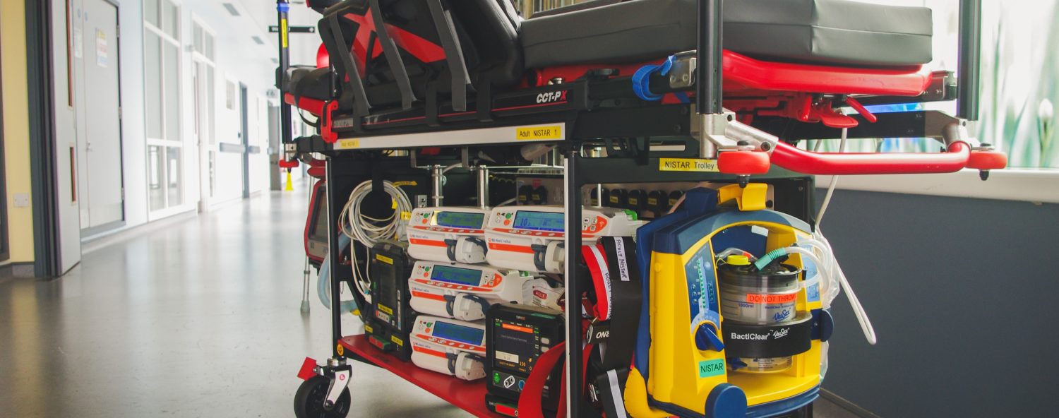 Patients are transferred on a specialised critical care trolley equipped with a portable ventilator, intravenous drug infusion pumps and a critical care patient monitor.